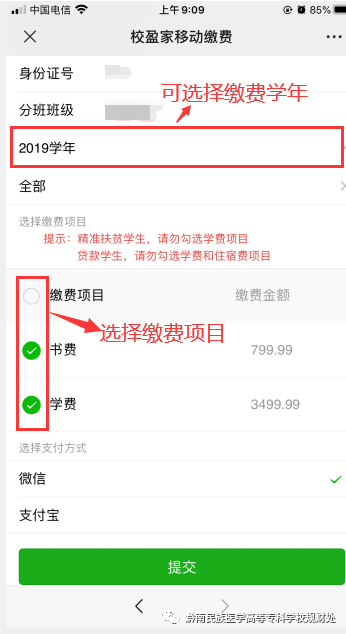先选择缴费学期(报名当期或欠费学期),勾选缴费项目,选择支付方式“微信”或“支付宝”,点“提交”,进入“立即支付”,继续完成微信或支付宝支付。