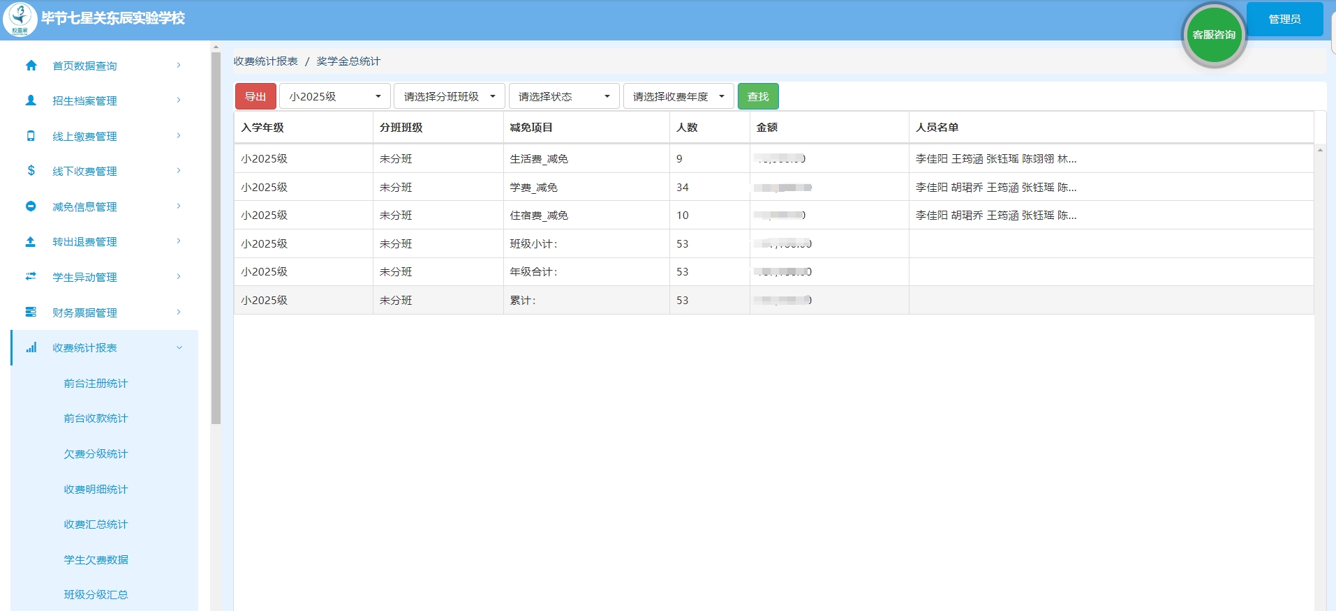 平台将学校的各项收⽀数据汇集成清晰、直观的统计报表。从应收、实收、⽋费到各项开⽀,管理者可以实时掌握学校的财务脉搏,实现预算的精准规划与资⾦的⾼效利⽤,为学校的稳健发展提供了坚实的数据⽀撑。