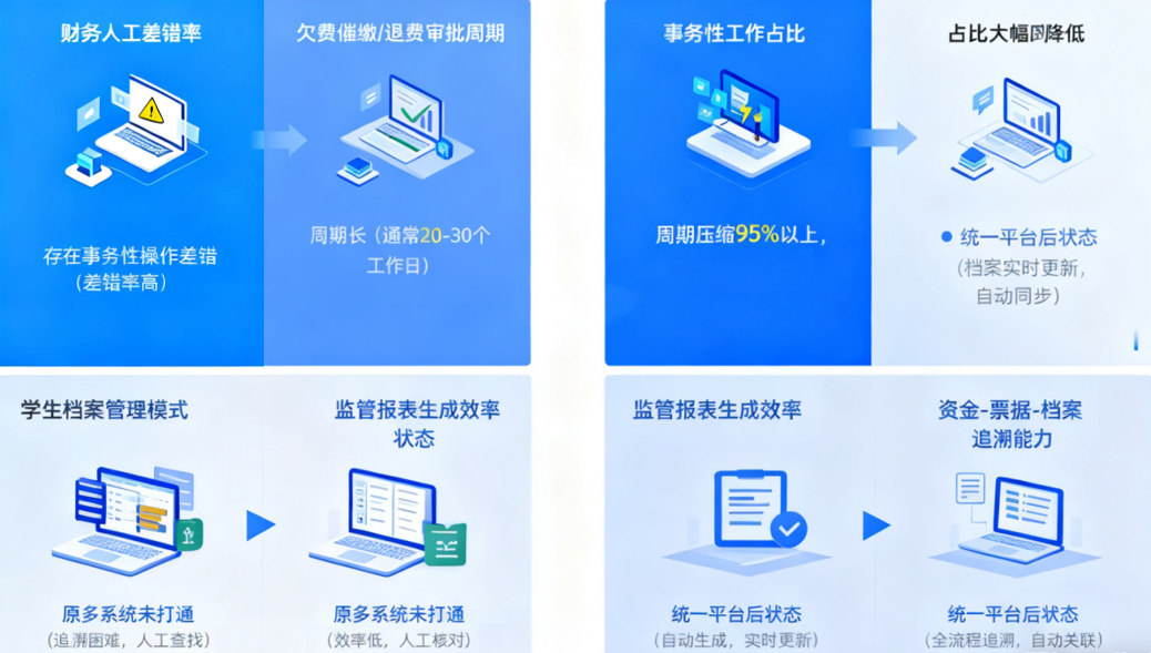 在与学校财务业务深度协同,实现了学生缴费计划自动生成、状态实时同步,构建起“资金-票据-档案”全链路可追溯的数字缴费闭环,财务人工差错率归零。学生欠费催缴、退费审批线上化闭环运转,整体办理周期压缩95%以上,财务人员从单据核对等事务性工作中解放,转向采购预算精准化、师资培训经费效能化、教育资源投入效益化等核心领域,全面升级为支撑学校育人战略的财政管理力量,助力教育数字财政建设落地见效。
