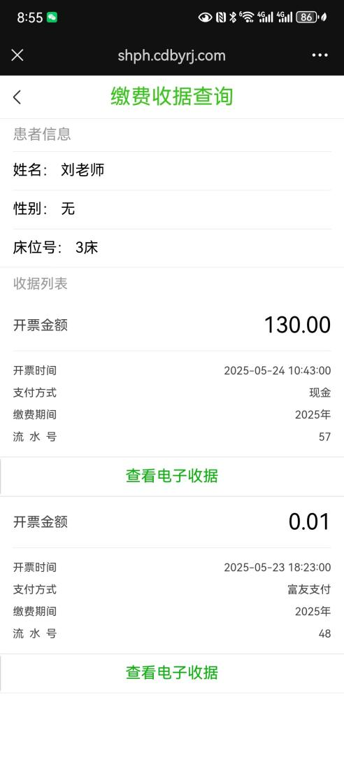 病员家属完成线上缴费后,即可随时在线查询电子收据,方便又环保。即使是线下制单收费,线上电子收据也能同步更新,无需打印,轻松实现无纸化办公。