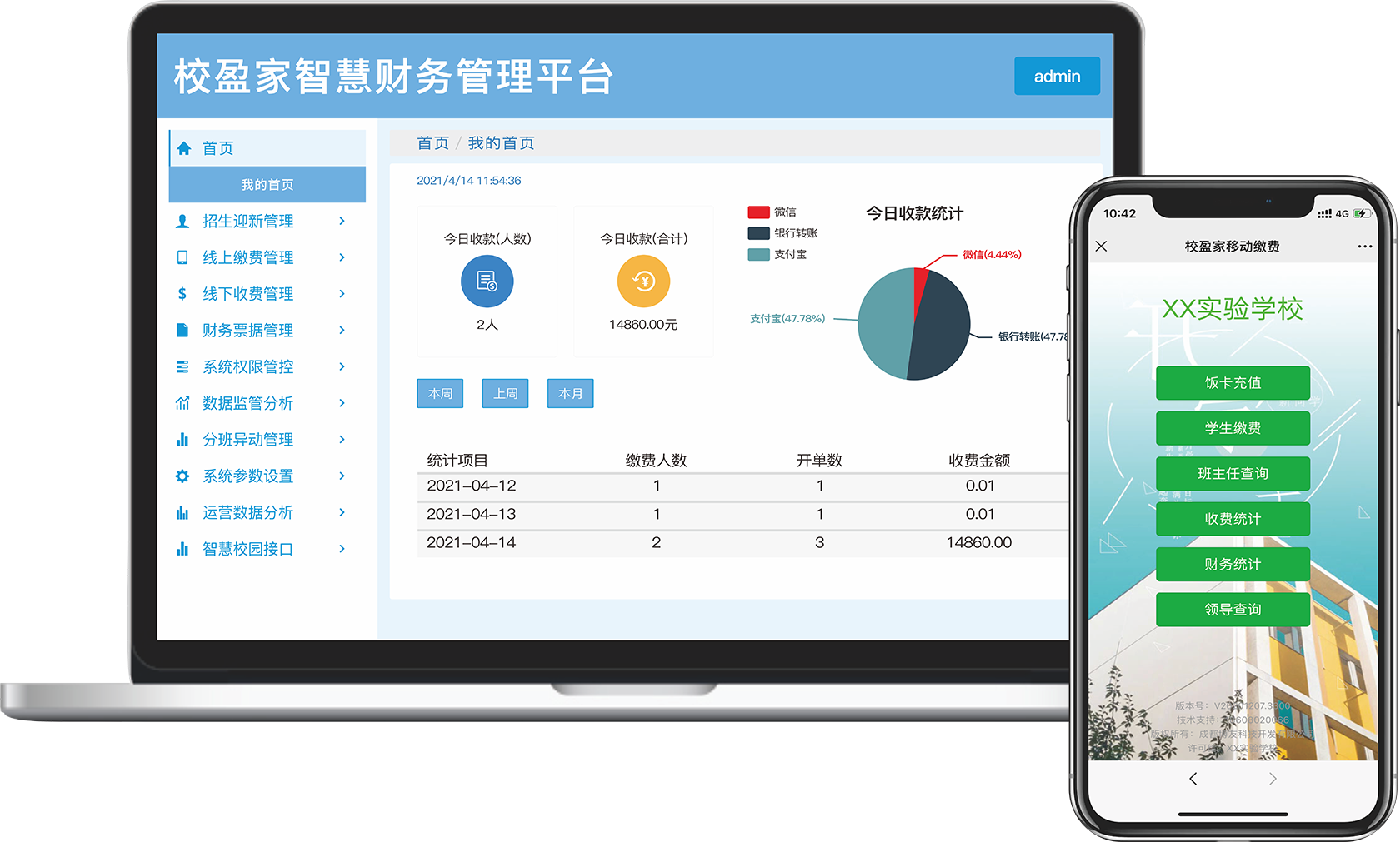 校盈家通过搭建统一的数字化管理中台,打通了校园各业务系统与财务系统的数据接口,让招生、教务、财务、后勤等各板块业务数据能够实时同步。以学生收费管理为例,平台支持学费、住宿费、代办费等各类费用的收缴,学生和家长可通过线上微信、支付宝等多渠道便捷缴费,缴费数据实时自动同步至系统后台,自动生成电子票据,彻底告别人工录入的繁琐与误差。