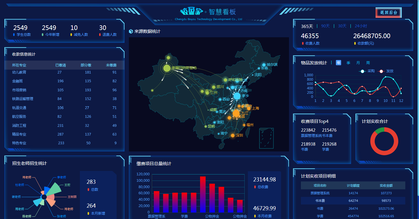 校盈家智慧校园一体化管理平台不仅具备招生和缴费的基本功能,还集成了强大的数据分析和可视化工具。系统能够自动统计和分析招生、缴费等相关数据,生成直观的图表。这些数据为学校管理层提供了科学的决策依据,帮助他们更好地了解学校的招生情况、缴费进度以及潜在问题,从而制定出更加合理、有效的管理策略。