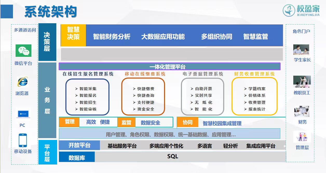 校盈家校园财务系统正是针对传统财务管理的这些痛点而设计的,它集成了招生报名管理、迎新报到一码通管理、在线缴费管理、财务收费管理,电子票据管理等,通过线上移动缴费与线下现场收费一体化管理,收费票据与税务发票、非税票据一体化管理,招生与财务、教务档案信息一体化管理,学生家长自助缴费项目选择与收费标准一体化管理,收费数据与各个支付平台数据一体化管理,帮助学校去实现财务收费的智能化管理、精细化管理、数字化管理、票据无纸化,让学校财务管理更加轻松高效。并且多平台的互联互通,助力推动了中国教育服务信息数字化管理的加速发展。在系统使用上,校盈家更是以“简单、灵活、智能”为主,让使用者轻松上手。