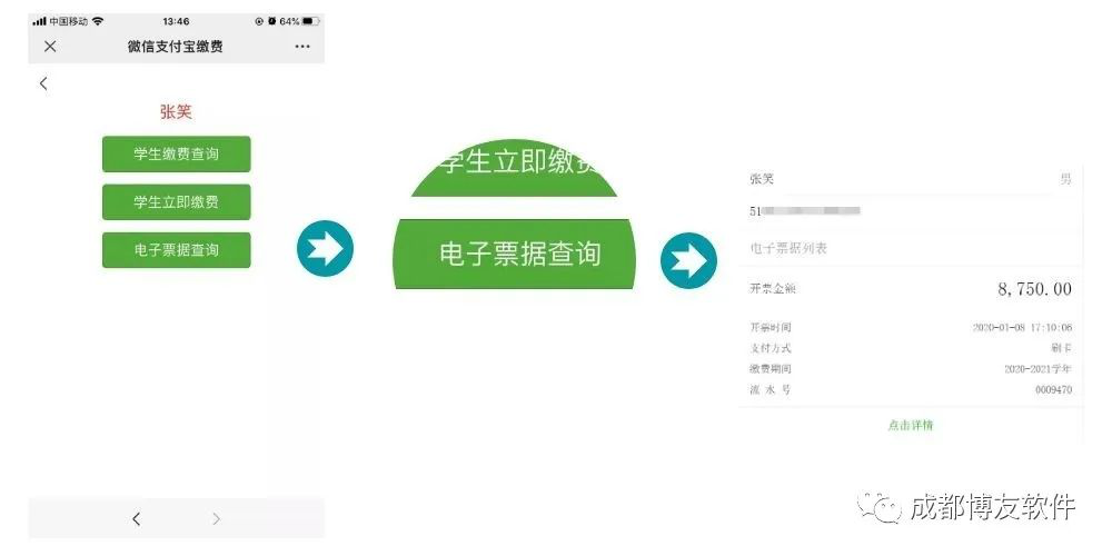 自主缴费完成后,手机上可立即查询缴费凭证,真正实现学生家长的“自助”缴费