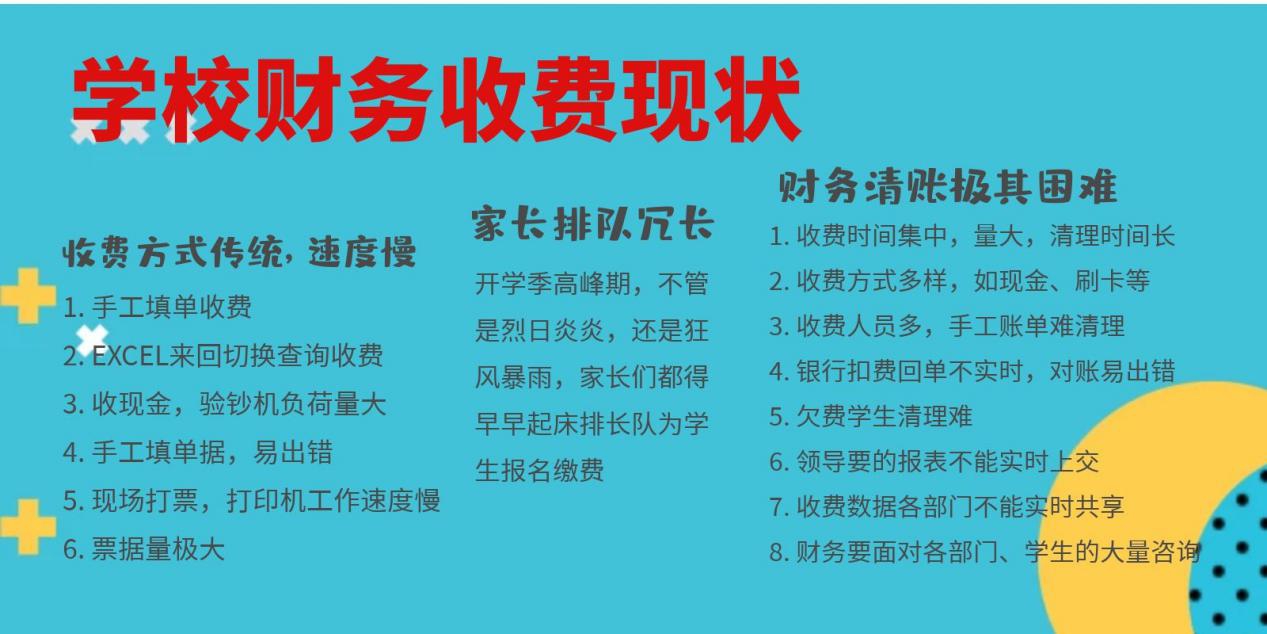 这种情况下,只能以现金收费和刷卡收费相完成各项费用的收缴,因此,每年收费季节,排长队现象严重,师生员工意见较大。