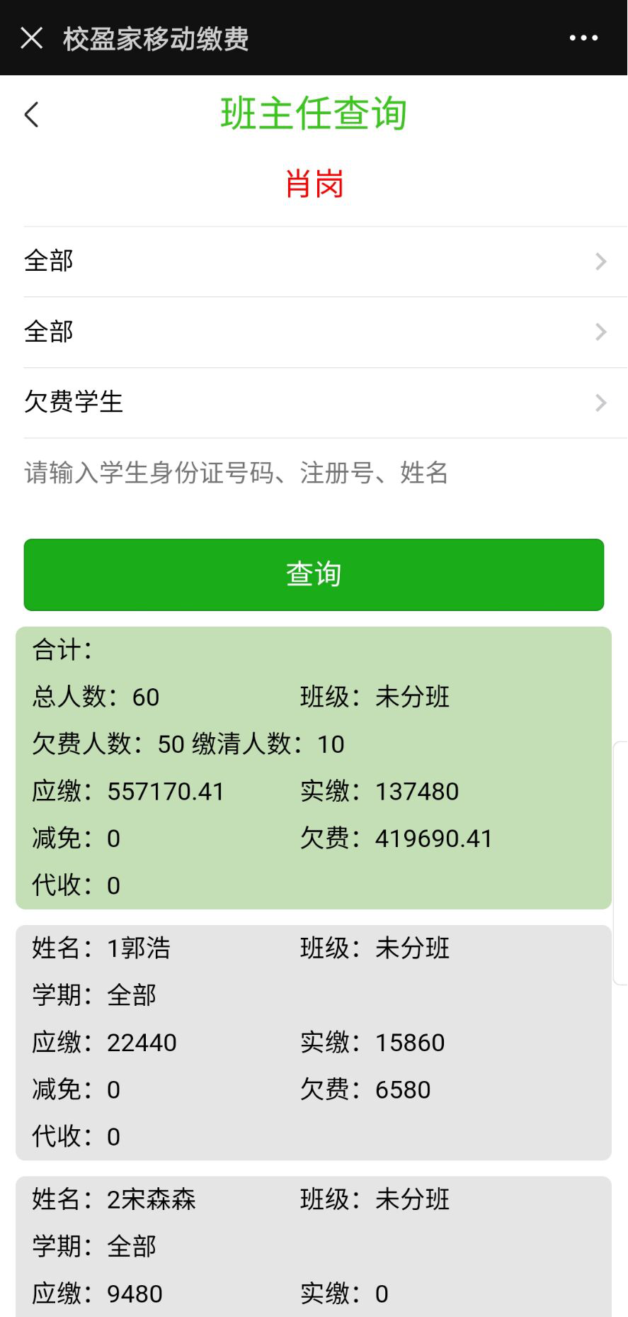 2) 班主任登录系统后,即可查看自己班级学生的缴费信息。