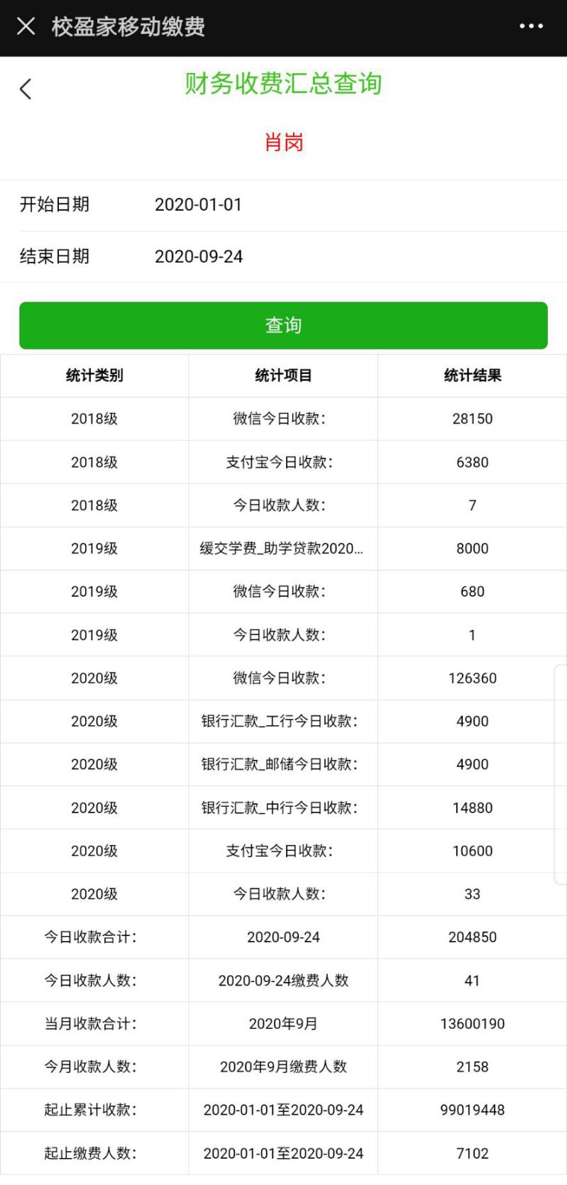 通过校领导手机查询通道,校领导可以实时了解学校的收费汇总数据。