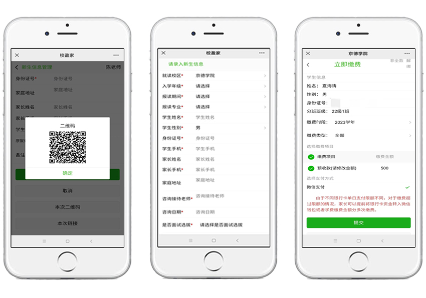因学校招生缴费流程繁琐,校盈家实现学校线上招生预缴费管理,一键采集学生信息,自动统计招生来源和缴费数据,让学校招生缴费更智能。