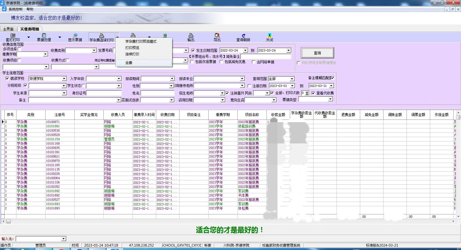 四川科技职业学校京德学院采用全日制3+2办学制,学校开设高铁、汽修、航空、护理、幼师等多个热门专业,是一所专业成熟、师资雄厚的院校。因学校收费方式传统,收费项目多,校盈家财务收费管理实现了学校招生、缴费、财务分账智能化管理,大大提高学校收费效率。